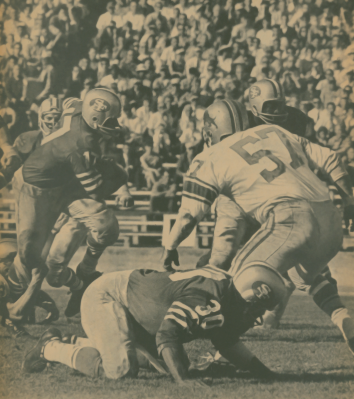 Newly acquired from the New Orleans Saints, QB Billy Kilmer directs the Washington Redskin offense against the San Francisco defense as longtime lineman Charlie Krueger (#70) fights fights to get into the backfield. Also pictured for the redskins are center Len Hauss (#56), guard John Wilbur (#60) and fullback Charlie Harraway (#31).