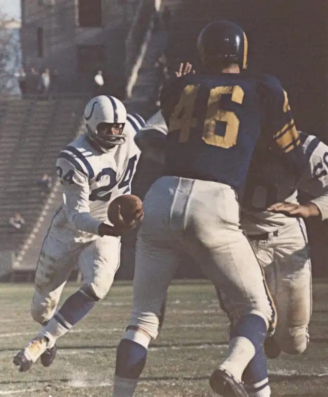 The Colts Hall of Famer makes a 17-yard gain against the Rams in a 1957 contest. Moving in to stop him are defenders Will Sherman (#43) and Art Hauser (#65).