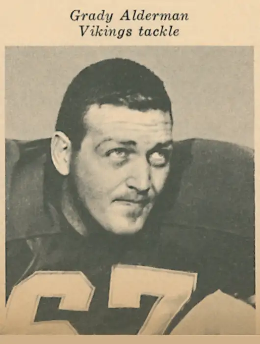 A graduate from Detroit Mercy College, Grady Alderman was Detroit’s 10th round pick in 1960. By 1961 he was starting at left tackle for the Minnesota Vikings. He remained with the Vikings for 14 years playing in 6 Pro Bowls and making the All Pro Team in 1969.
