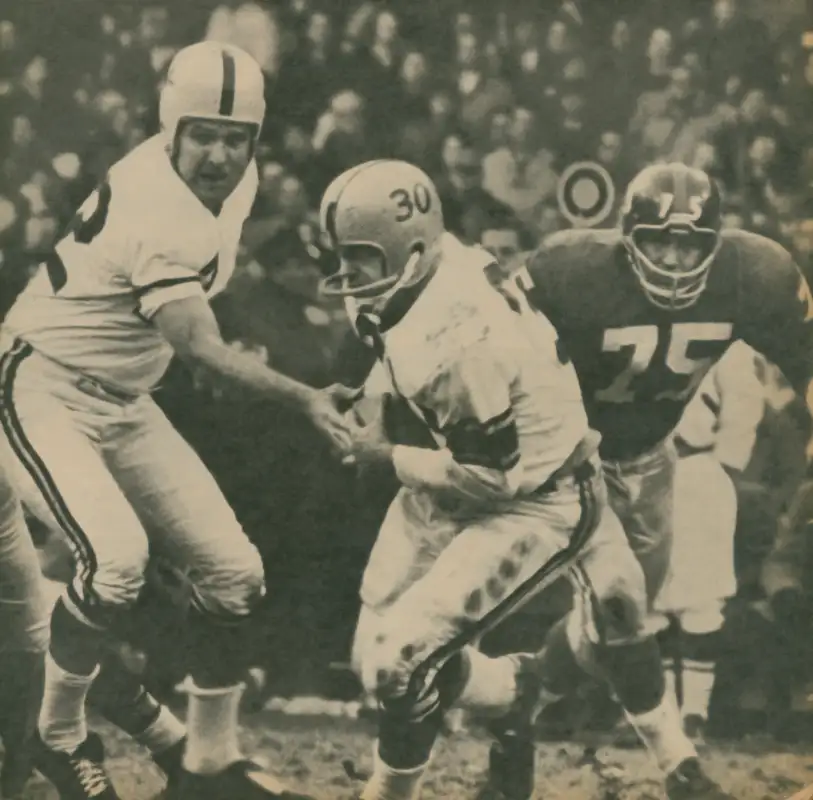 Steelers QB Bobby Layne handing off the veteran runner Tom Tracy, probably around 1961. By this time Layne was nearing the end of his colorful 15-year career and had actually tied the great Sam Baugh for the All-Time Touchdown Passes lead. He ended his career the next year surpassing Baugh with a total of 196 TDs, but so do YA Tittle.