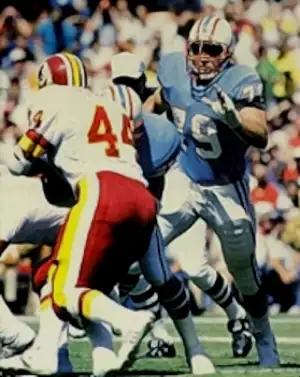 Some 1980s NFL gameplay. The Oilers Ray Childress moves in on Redskin John Riggins. Childress was a 6-time Pro Bowl player in his 12-year career.